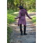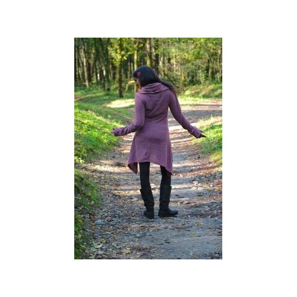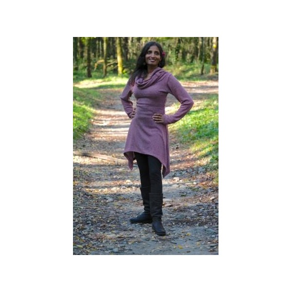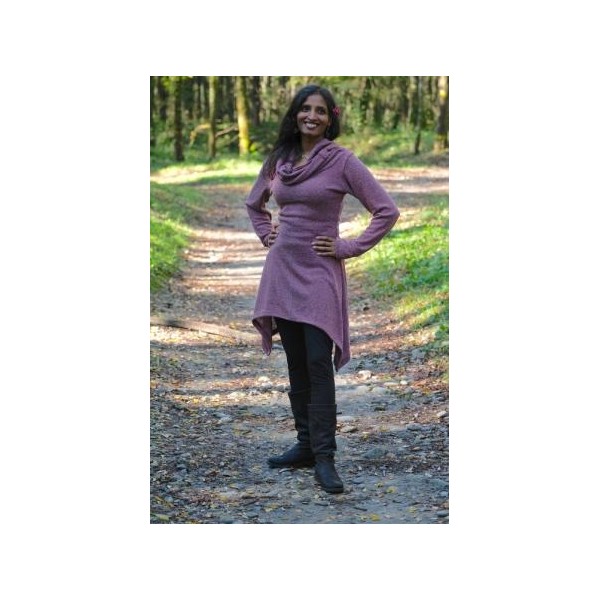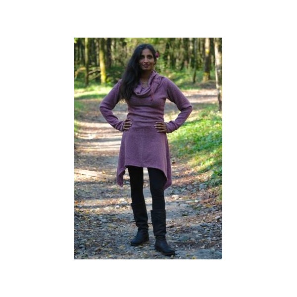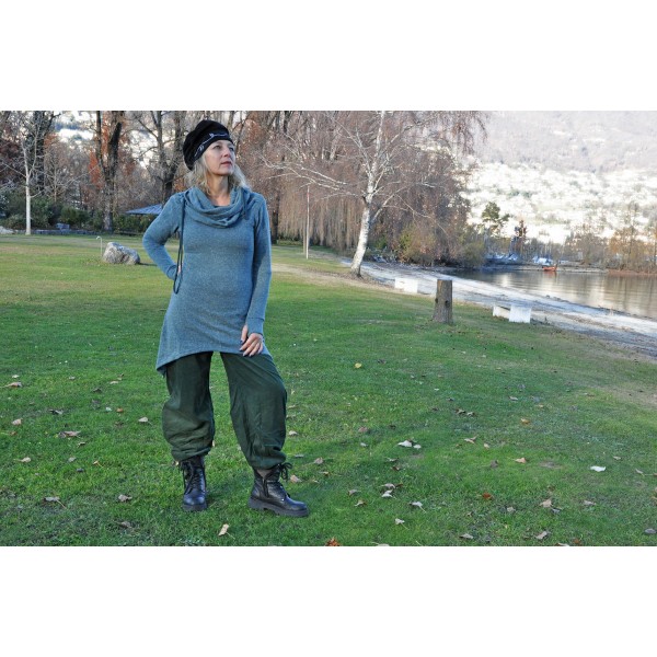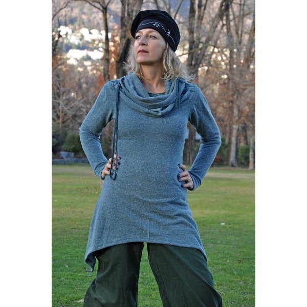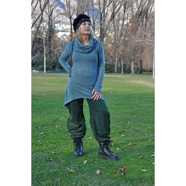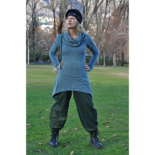 Vestio in caldo cotone knitted tinta unita a maniche lunghe. Particolare il taglio a punte laterali più lunghe e l'ampio collone a barchetta.