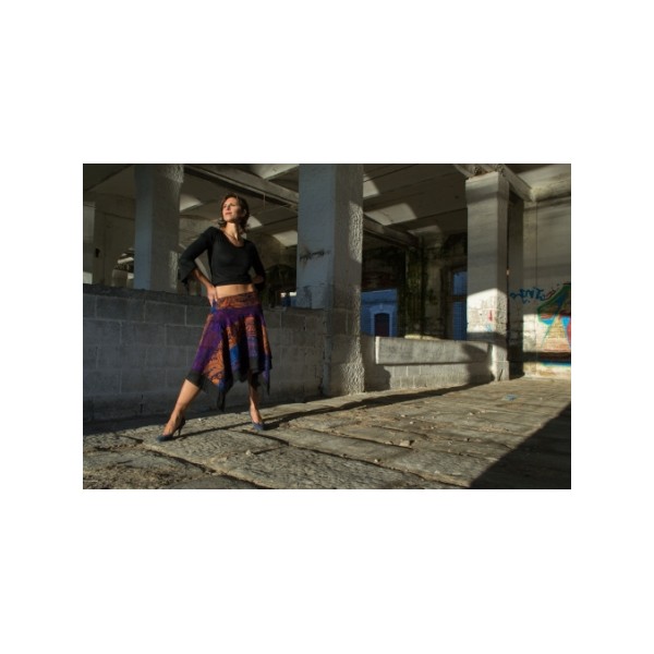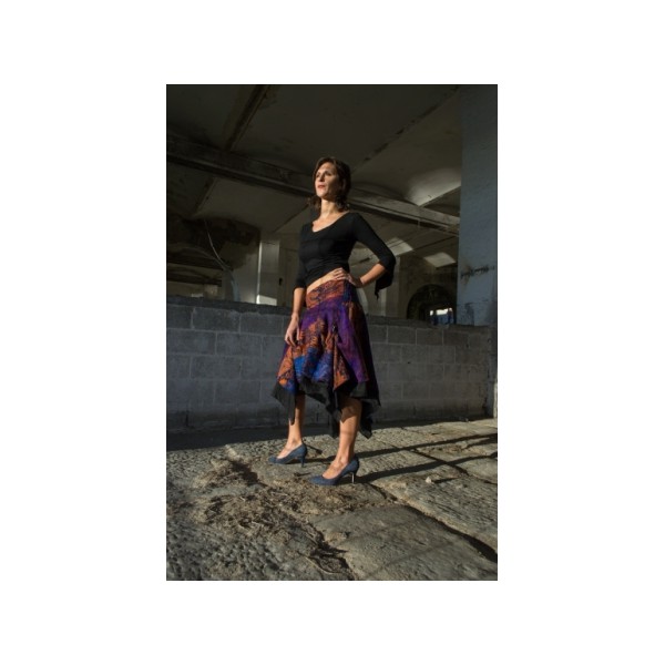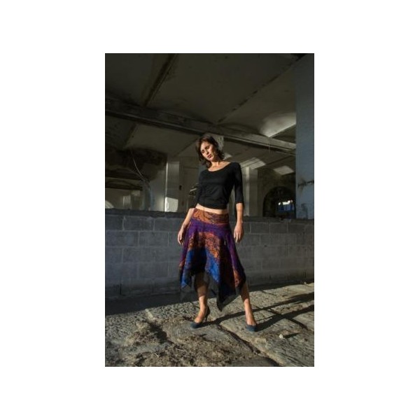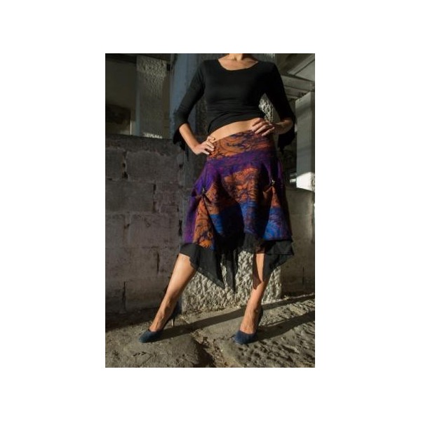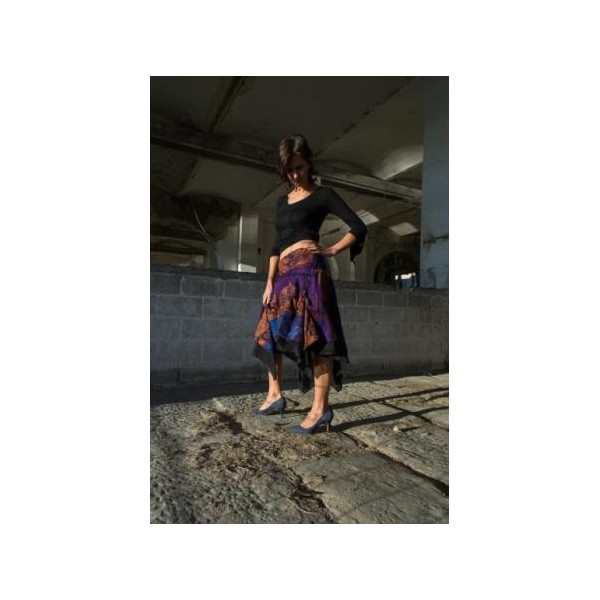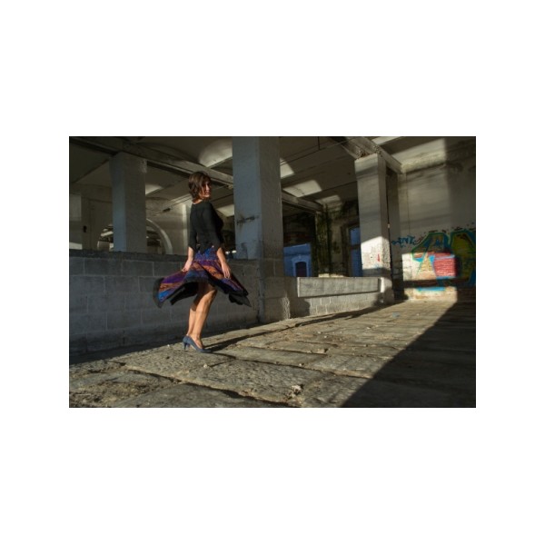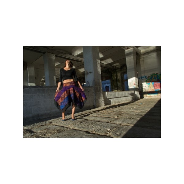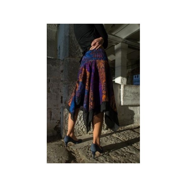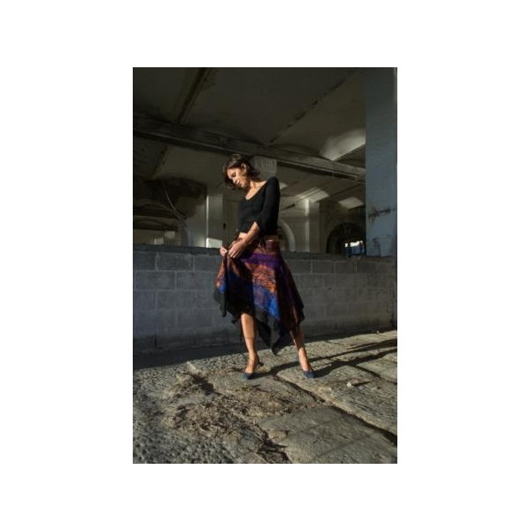 Una gonna asimmetrica a punte, regolabile in lunghezza grazie a dei gancetti di metallo. E' realizzata con uno strato di cotone nero più lungo sotto, sovrapposto da uno strato di caldo jaquard fantasia. La fascia in vita è elasticizzata e plisettata sulla schiena per una migliore vestibilità.