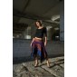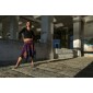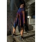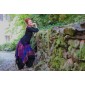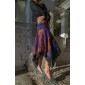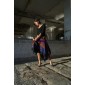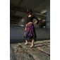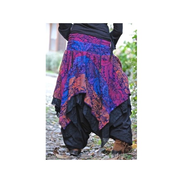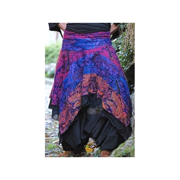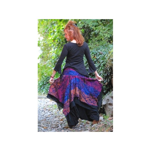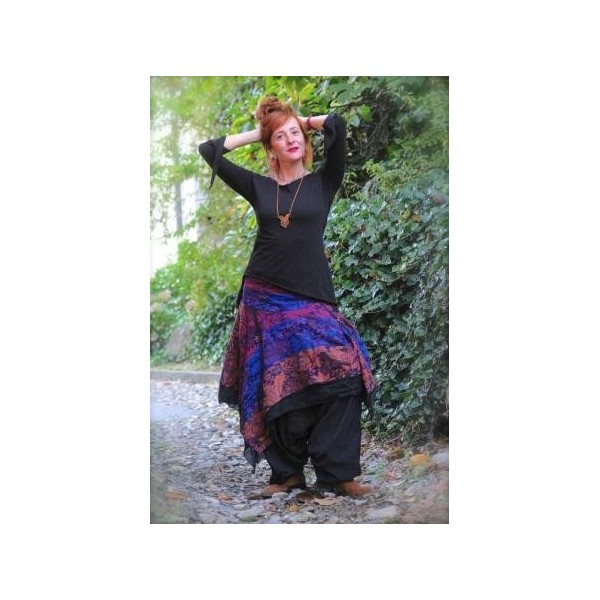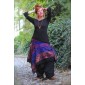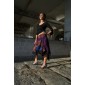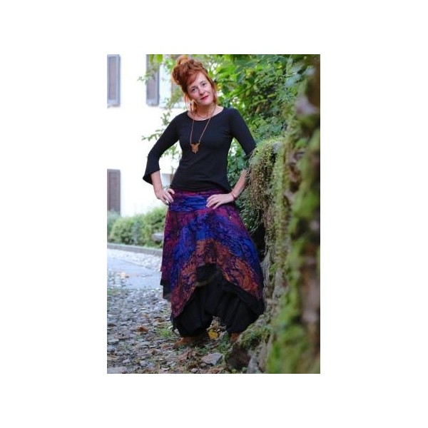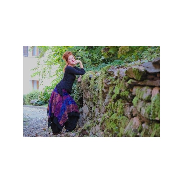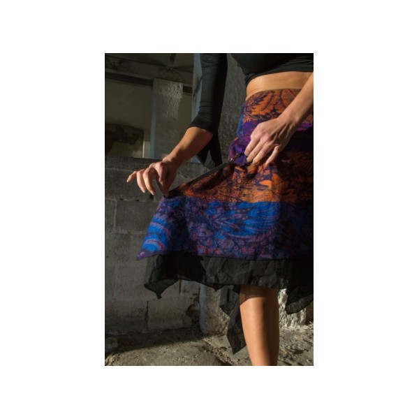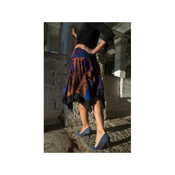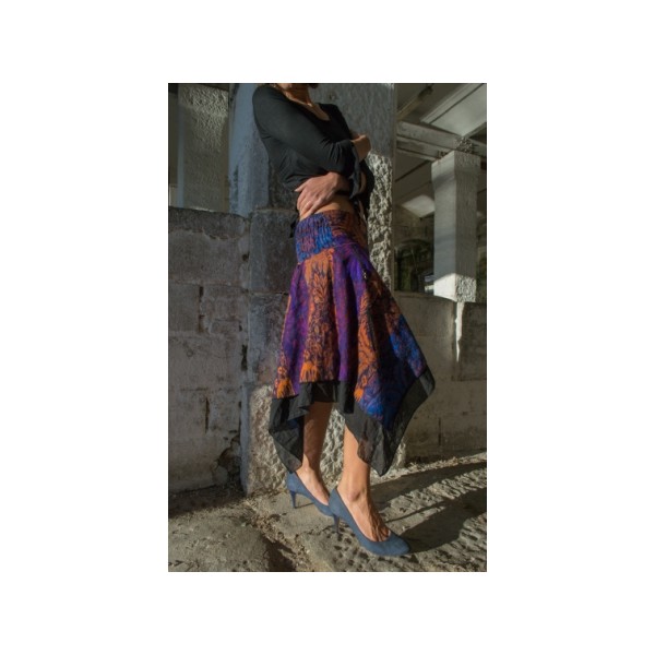 Una gonna asimmetrica a punte, regolabile in lunghezza grazie a dei gancetti di metallo. E' realizzata con uno strato di cotone nero più lungo sotto, sovrapposto da uno strato di caldo jaquard fantasia. La fascia in vita è elasticizzata e plisettata sulla schiena per una migliore vestibilità.