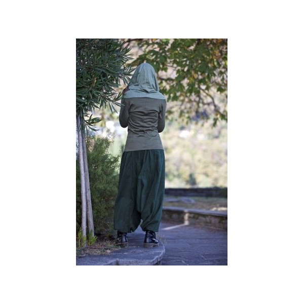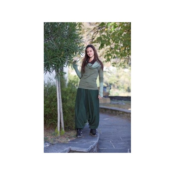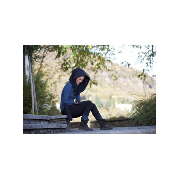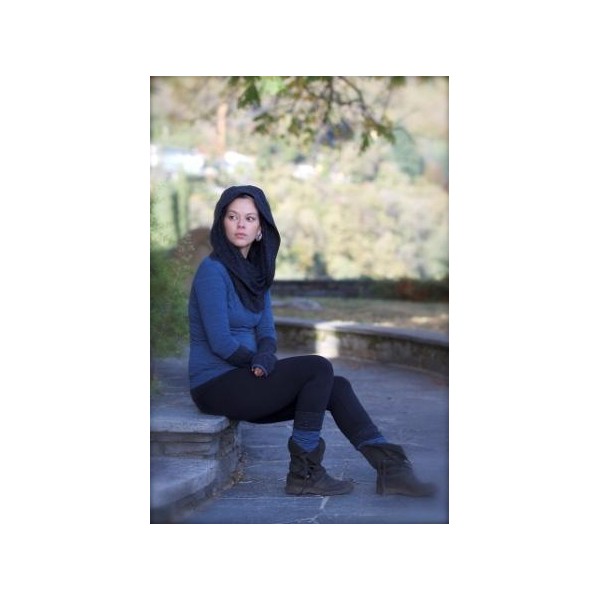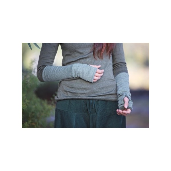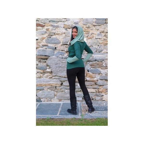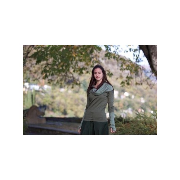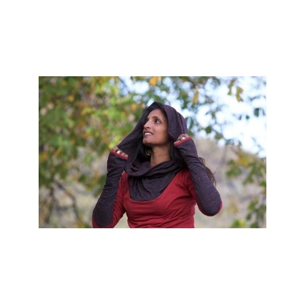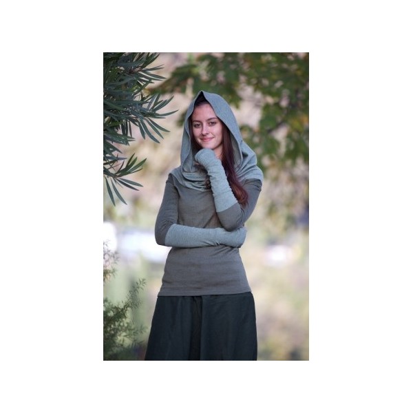 Una maglia in cotone a maniche lunghe con buchi per il pollice con ampio collone che diventa anche un cappuccio.
