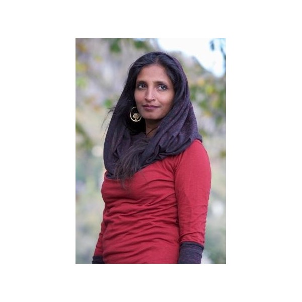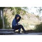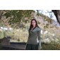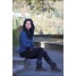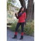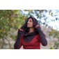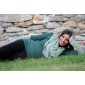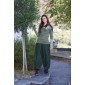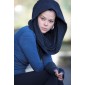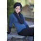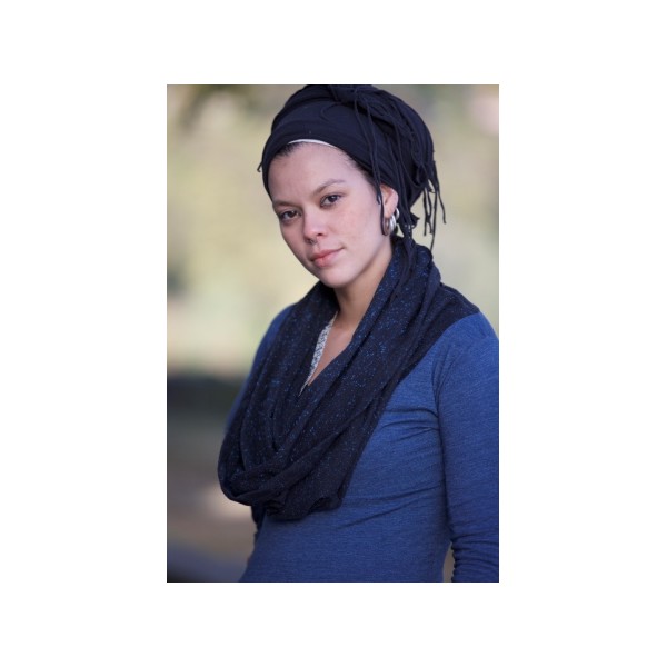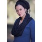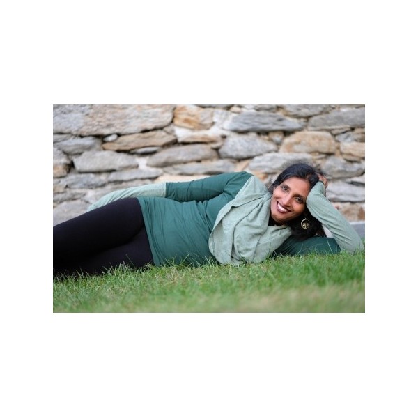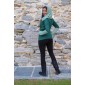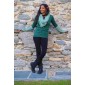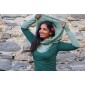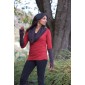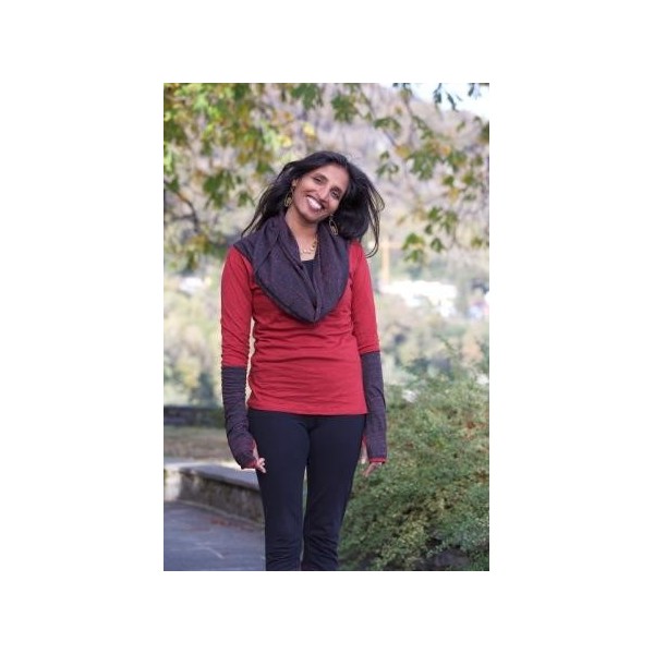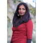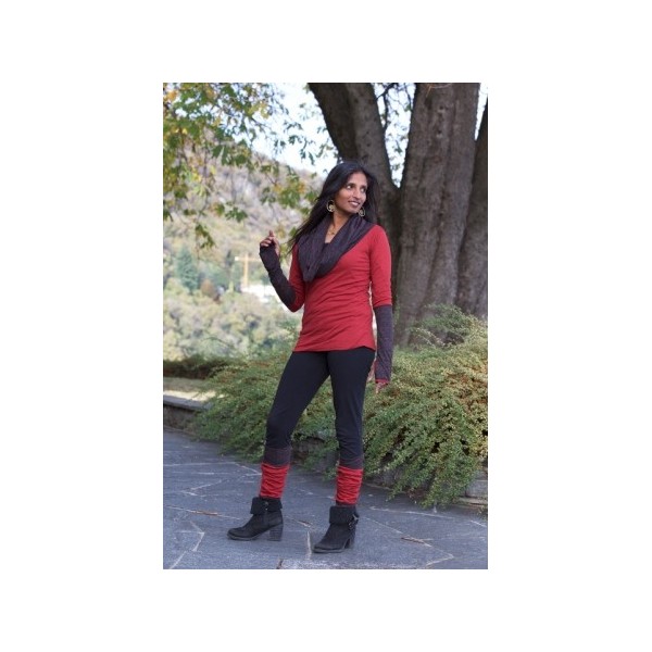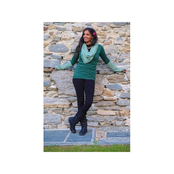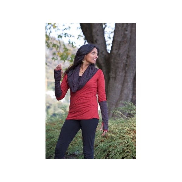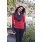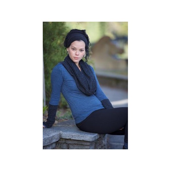 Una maglia in cotone a maniche lunghe con buchi per il pollice con ampio collone che diventa anche un cappuccio.