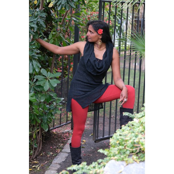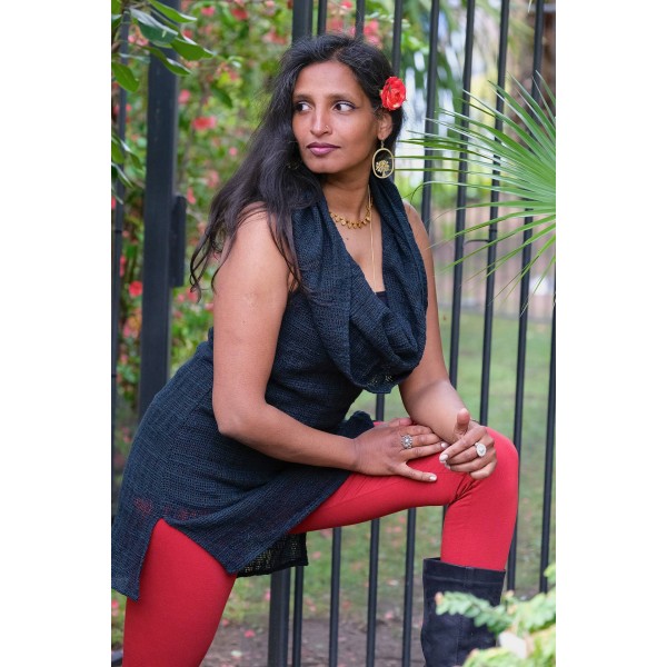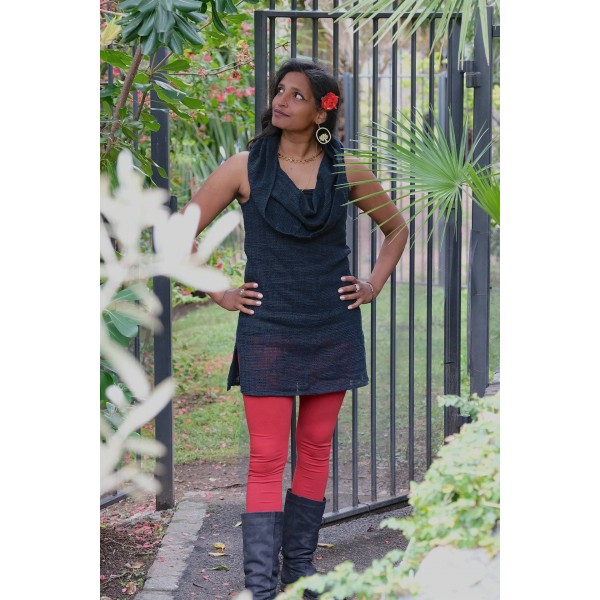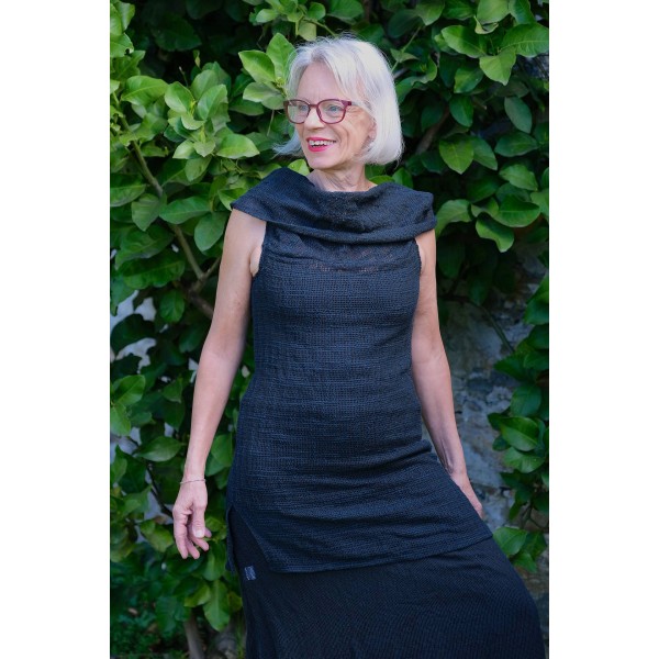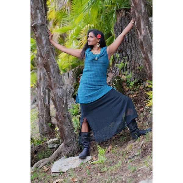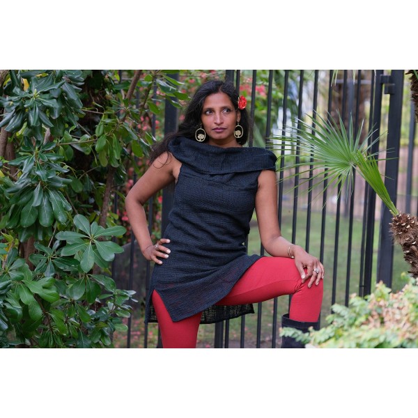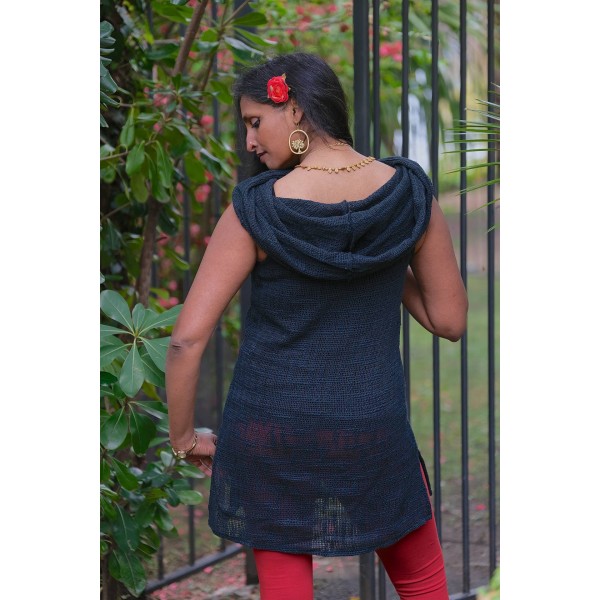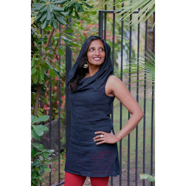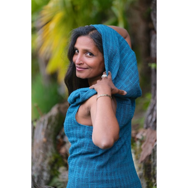 Tunica in cotone tessuto a mano, senza maniche, con collo ampio che si può usare come scialle appoggiandolo sulle spalle oppure come cappuccio. Ha 2 spacchetti ai lati.